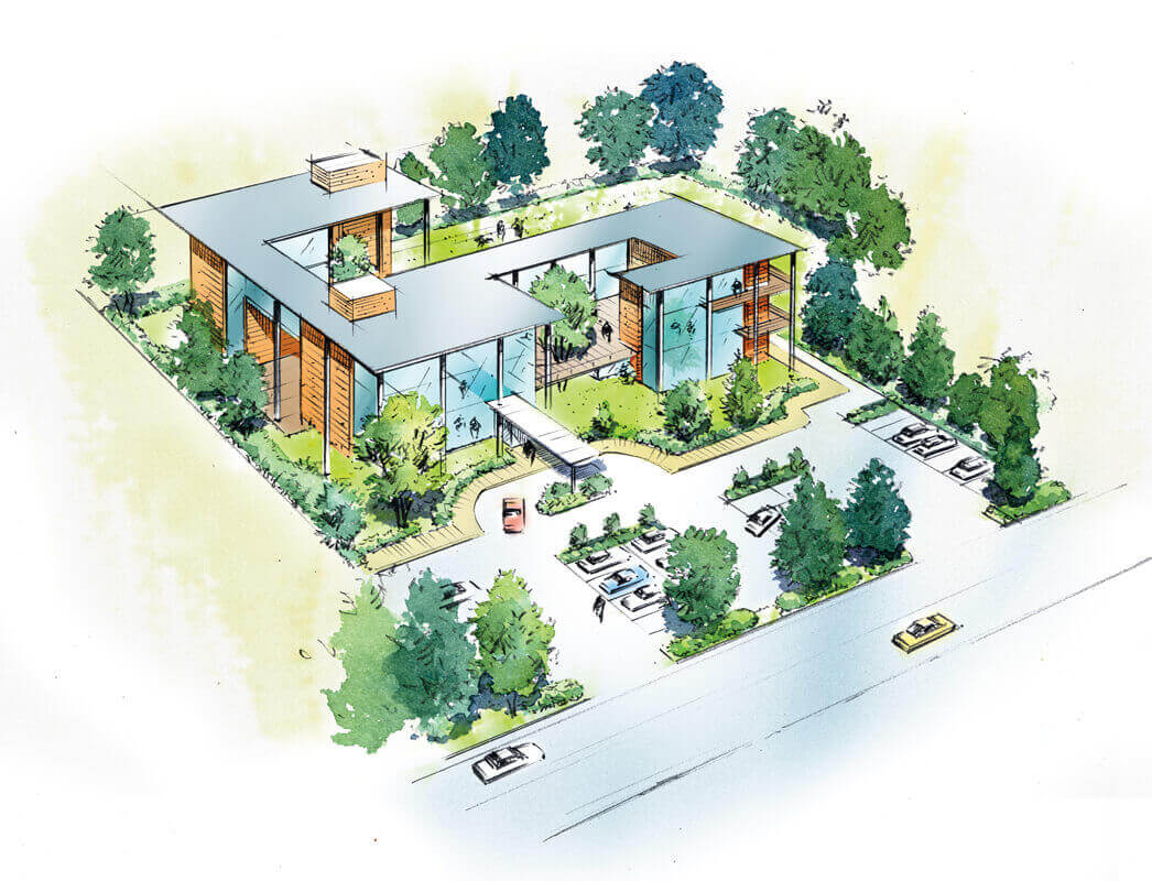 千葉県長生村交流センター鳥瞰パース(基本設計案) 千葉県木更津市市庁舎鳥瞰パースです 千葉県長生村交流センター鳥瞰パースです