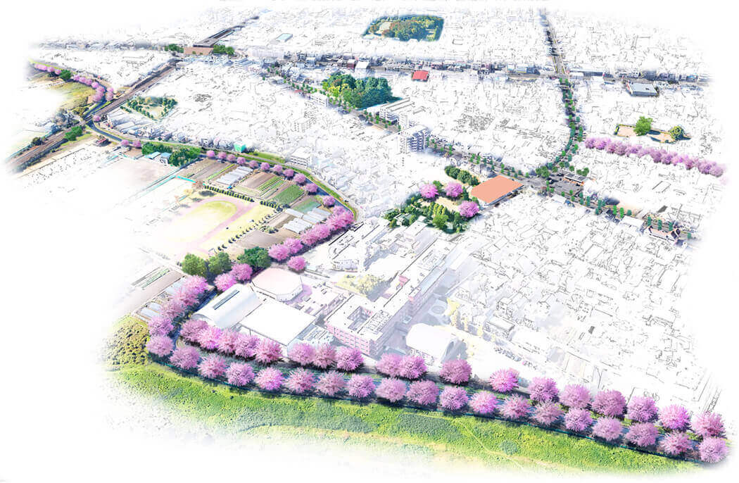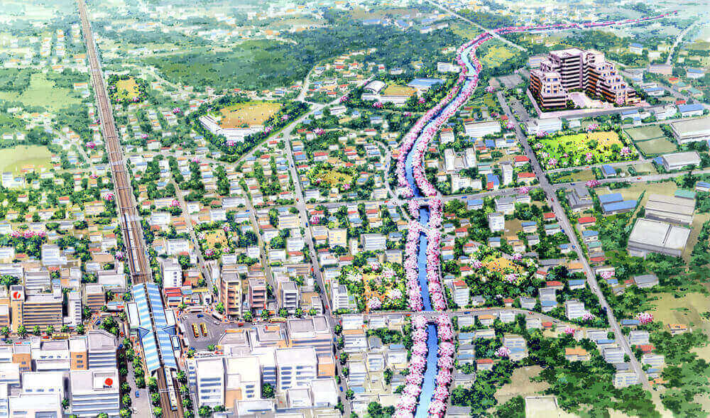 見沼代用水西縁(みぬまだいようすいにしべり)沿い上空からの街並みイラストです。左奥に東浦和の駅が見えています。見沼代用水西縁沿いの桜並木と、菜の花は見事です。桜回廊の総延長は、20.25キロ、ソメイヨシノを中心に多数の桜を長く楽しむことができるそうです。街並みイラストの主要以外なものをグレーでトーンを抑えています。