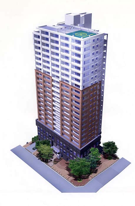 門前仲町デザイナーマンションの鳥瞰パース。眼下に桜と大横川を臨みます