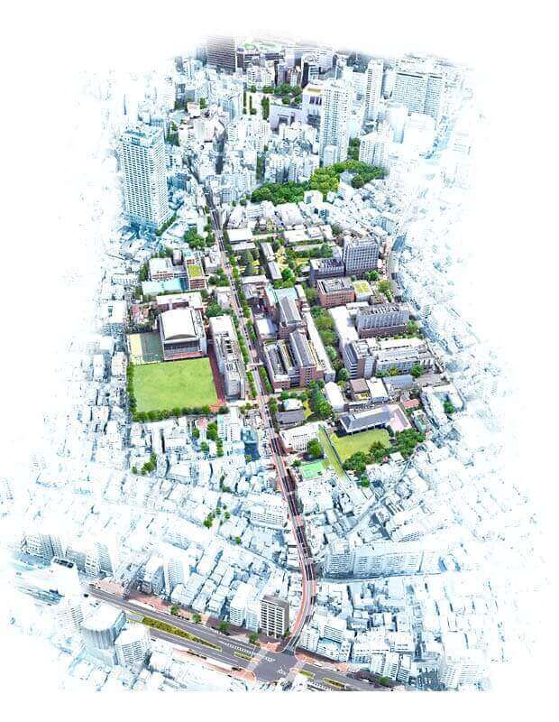 JR中央線沿いのグリーンのグランド、早稲田実業の先(赤のエリア)が現地です。街並みイラストに見える主眼以下のものはトーンを抑えて緑豊かな街を演出しました。 ツインタワーマンションと周辺駅ビルは検索サイトなどを参考にして、CGソフトでモデリングしていますので、アングルを変える事が可能です。