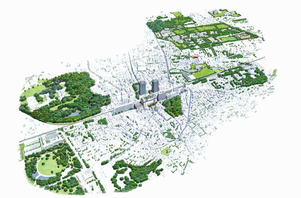 JR国分寺駅周辺の鳥瞰街並みイラストです。画の中心に見えるツインタワー下がJR国分寺駅です。