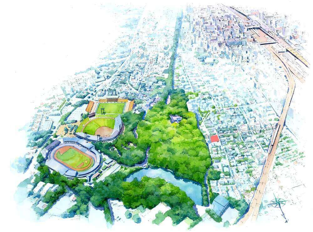 東京都武蔵野公園上空からの鳥瞰パース(街並みイラスト)