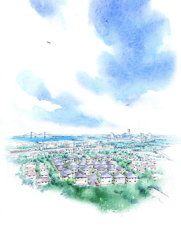 不動産販売ツールとして制作した横浜戸建ての街並みイラストです。