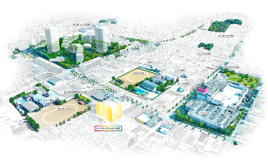 井の頭公園、JR吉祥寺駅、京王線久我山駅周辺の鳥瞰パース(街並みイラスト)